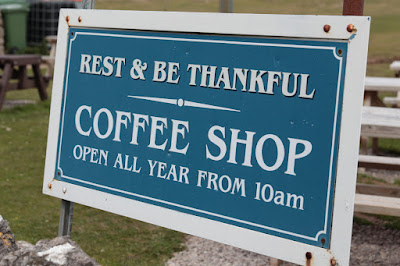 At the highest point, we rested and had our 2nd cuppa at a "Rest and be Thankful" cafe. Surly proprietor, if I may say. Not to mention is the very expensive coffee. It was money not well spent.