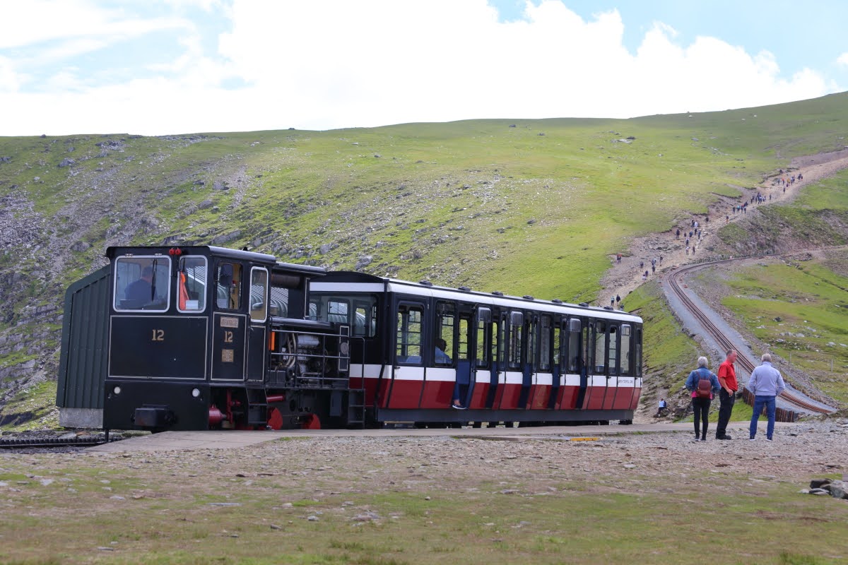 We took the 11am diesel train , compartment G, to Cogwyn. It was a slow 45 min but the uphill ride offers spectacular views of the mountains and Menai Straits. Of special mention is the sheer amount of people trodding up the unshaded trail path to the 1000m odd mountain. The weather is gradually warming up and it felt uncomfortable even sitting in the train, what more walking for hours in the sun. It was almost windless and not a tree was in sight 180m onwards.